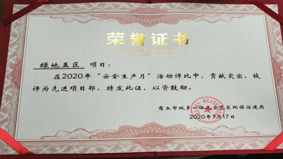 2020-08-18 巨匠·喜訊 | 我集團綠地五區項目部被評為2020年“安全生產月”先進項目部 近日,由商丘市城鄉一體化示范區環保住建局舉辦的2020年“安全生產月”活動評選結果出爐,我集團綠地五區項目部榮獲“先進項目部”稱號。 綠地...
