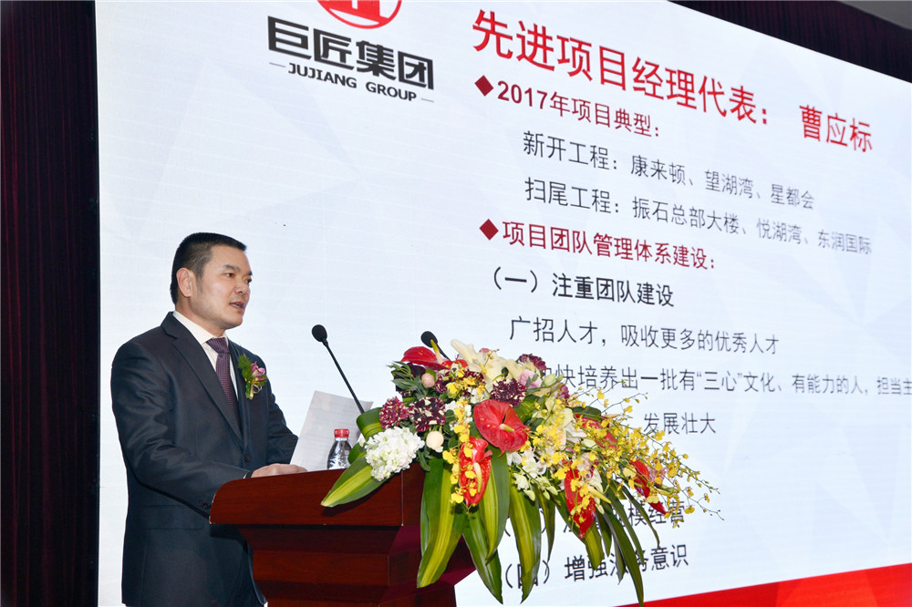1月27日,巨匠集團2017年度總結表彰大會在總部隆重召開。本次大會是貫徹落實黨的十九大和中央經濟工作會議精神,回顧總結2017年工作,表彰獎勵了年度先進集體、先進項目經理和先進工作者,部署2018年度工作目標的一次重要會議。全體行政人員、項目經理、優秀班組長及家屬朋友等1000余人參加會議。